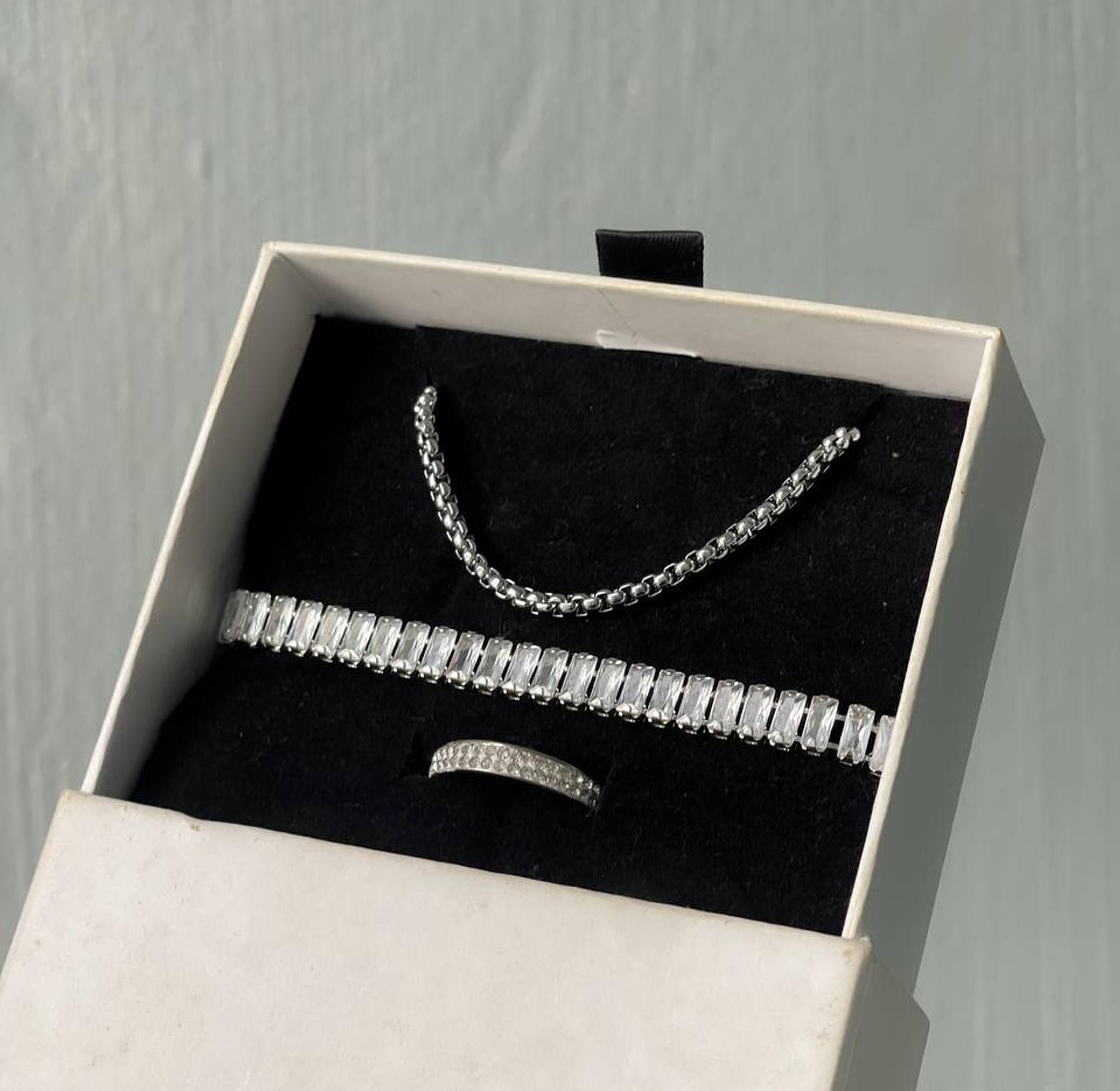 The combo comes with 1 bracelet from our collection( aster ), one silver ring ( ash slim silver ring ) and 1 chain( notion short silver chain)
