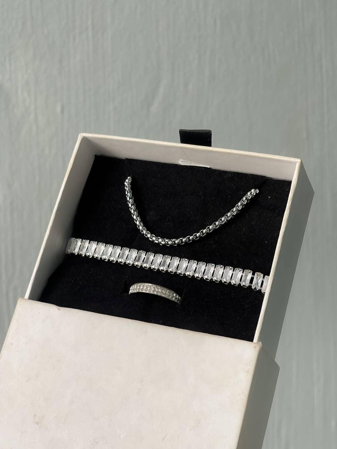 The combo comes with 1 bracelet from our collection( aster ), one silver ring ( ash slim silver ring ) and 1 chain( notion short silver chain)